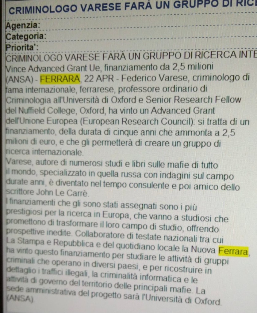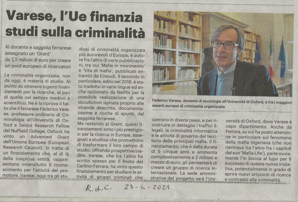 Professor Federico Varese said: “It is a great honour – and a great responsibility – to receive an Advanced Grant from the European Research Council. I am very much looking forward to starting these interrelated research projects on the activities of crime groups, with the aim to go beyond the catch-all- concept of ‘organised crime’. I will study how organised crime groups produce, trade and govern in a variety of settings across the globe.”